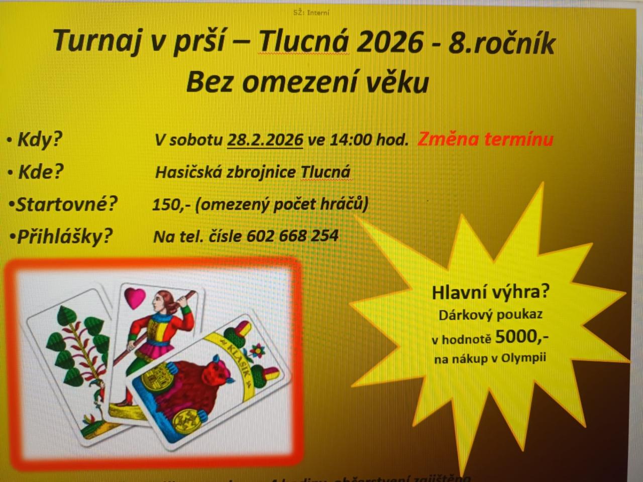 Zveme Vás na 8. ročník tradičního turnaje v PRŠÍ, který se uskuteční v sobotu 28. 2. 2026 od 14:00 v Tlucné.