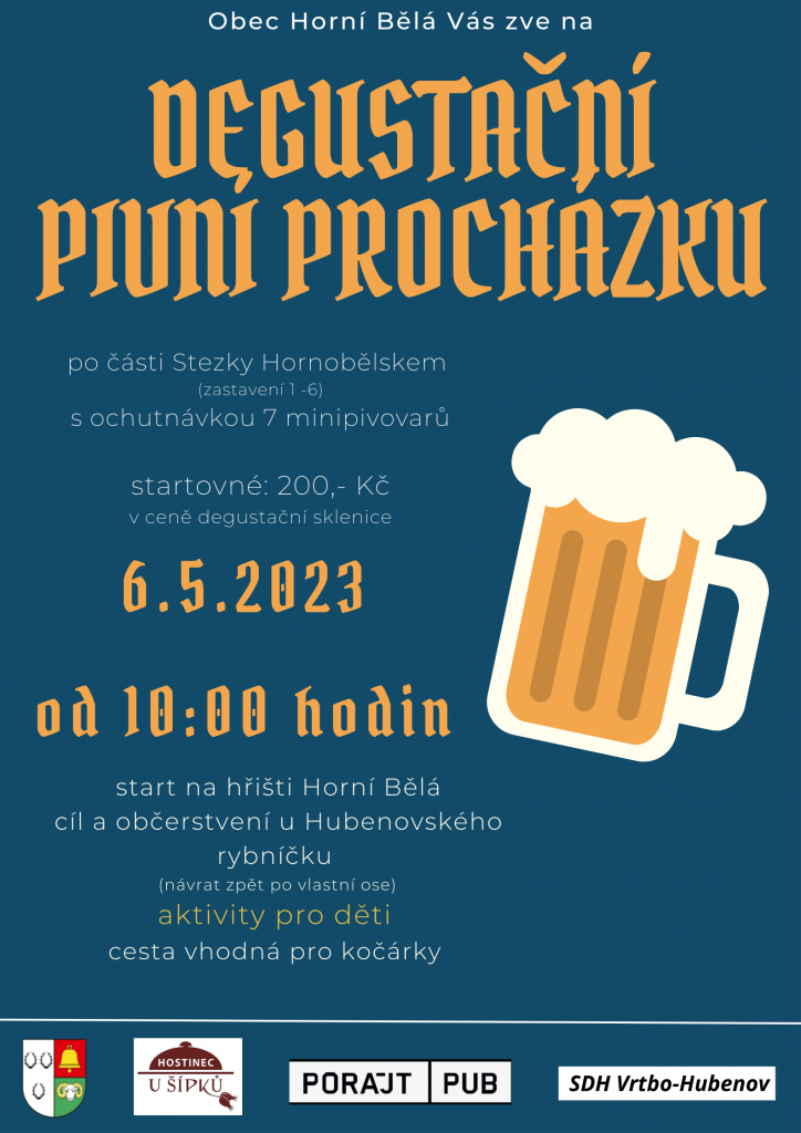 Obec Horní Bělá společně Hostincem u Šípků a SDH Vrtbo - Hubenov pořádá Degustační pivní procházku.