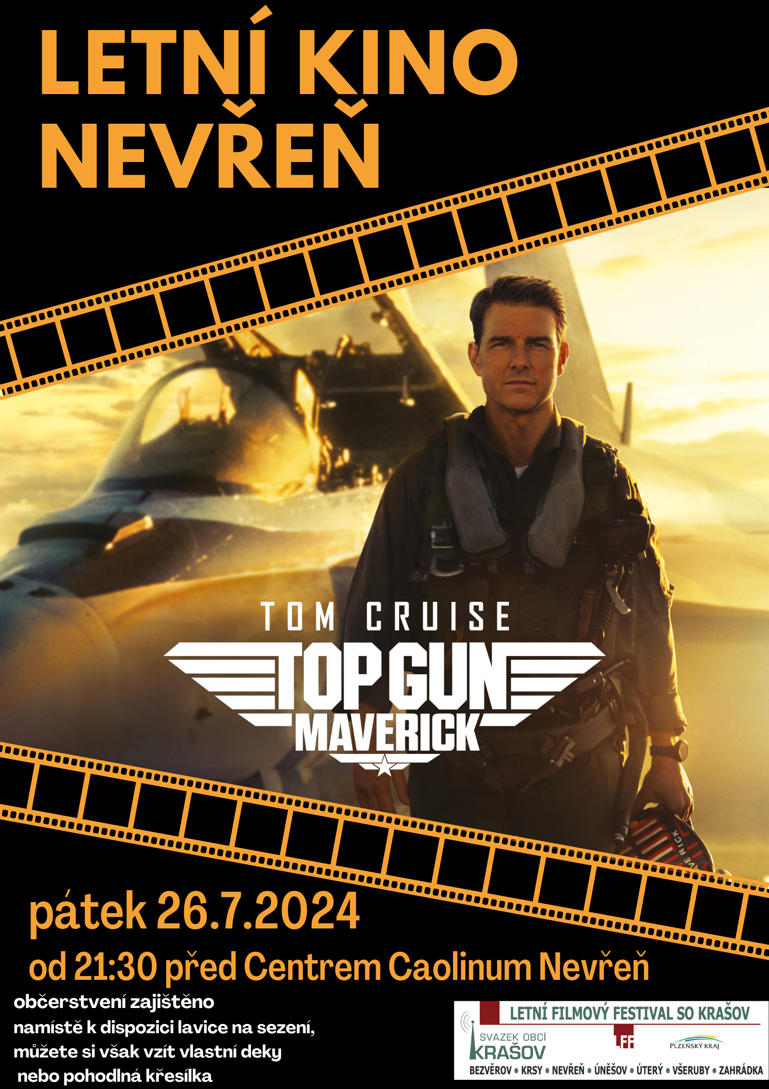 V rámci Letního filmového festivalu Krašov Vás obec Nevřeň zve na film Top Gun Maverick a to v pátek 26.7.2024 od 21:30 hod. Promítat se bude před Centrem Caolinum Nevřeň. Občerstvení i lavice na sezení bude zajištěno.