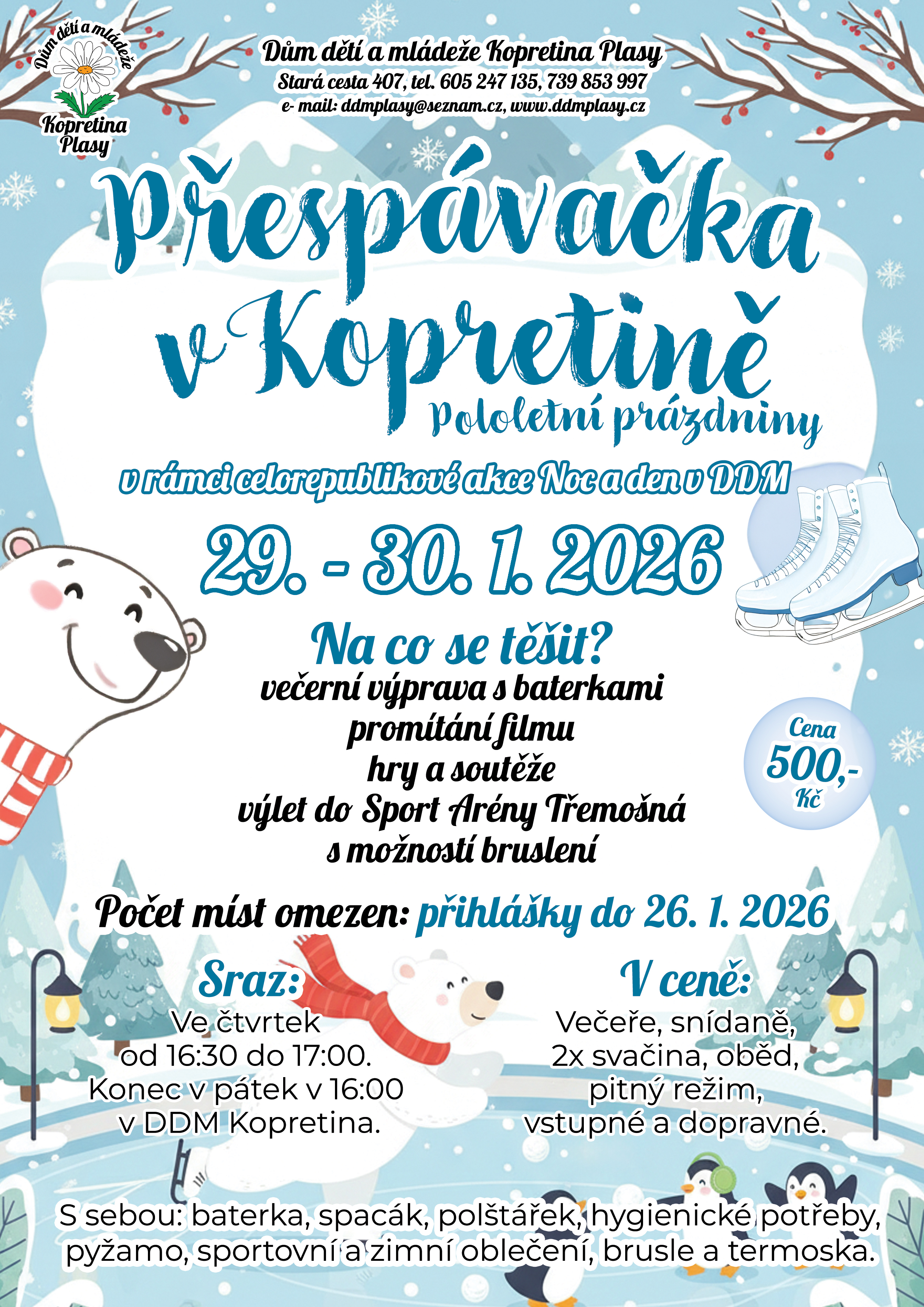 Na co se těšit? Večerní výprava s baterkami, promítání filmu, hry a soutěže, výlet do Sport Arény Třemošná.