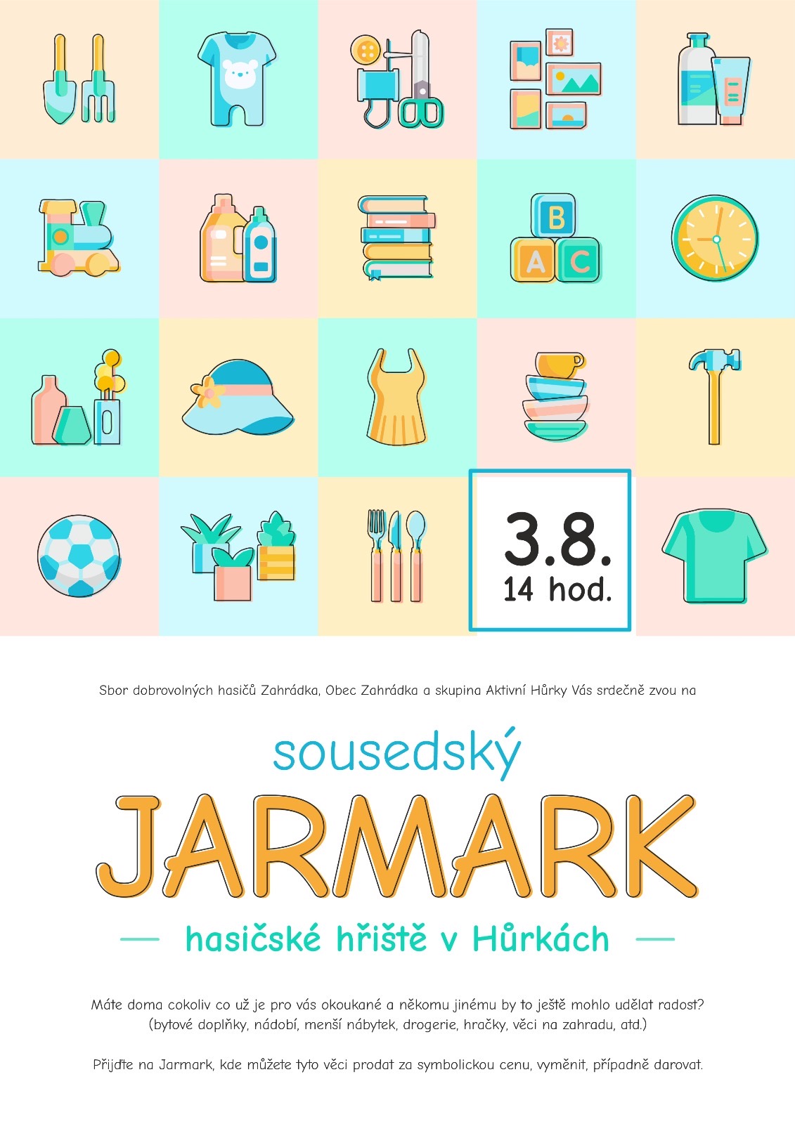 Obec Zahrádka, SDH Zahrádka a skupina Aktivní Hůrky Vás srdečně zvou na Sousedský jarmark, který se koná na hasičském hřišti v Hůrkách a to 3.8.2024 od 14 hod. Můžete zde cokoliv prodat, vyměnit, darovat (bytové doplňky, nádobí, drogerie, hračky, oblečení atd.).